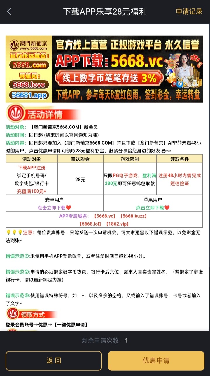 下载app。绑定基本信息即可。申请在优惠中心申请,是特邀的话,还可以申请特邀彩金