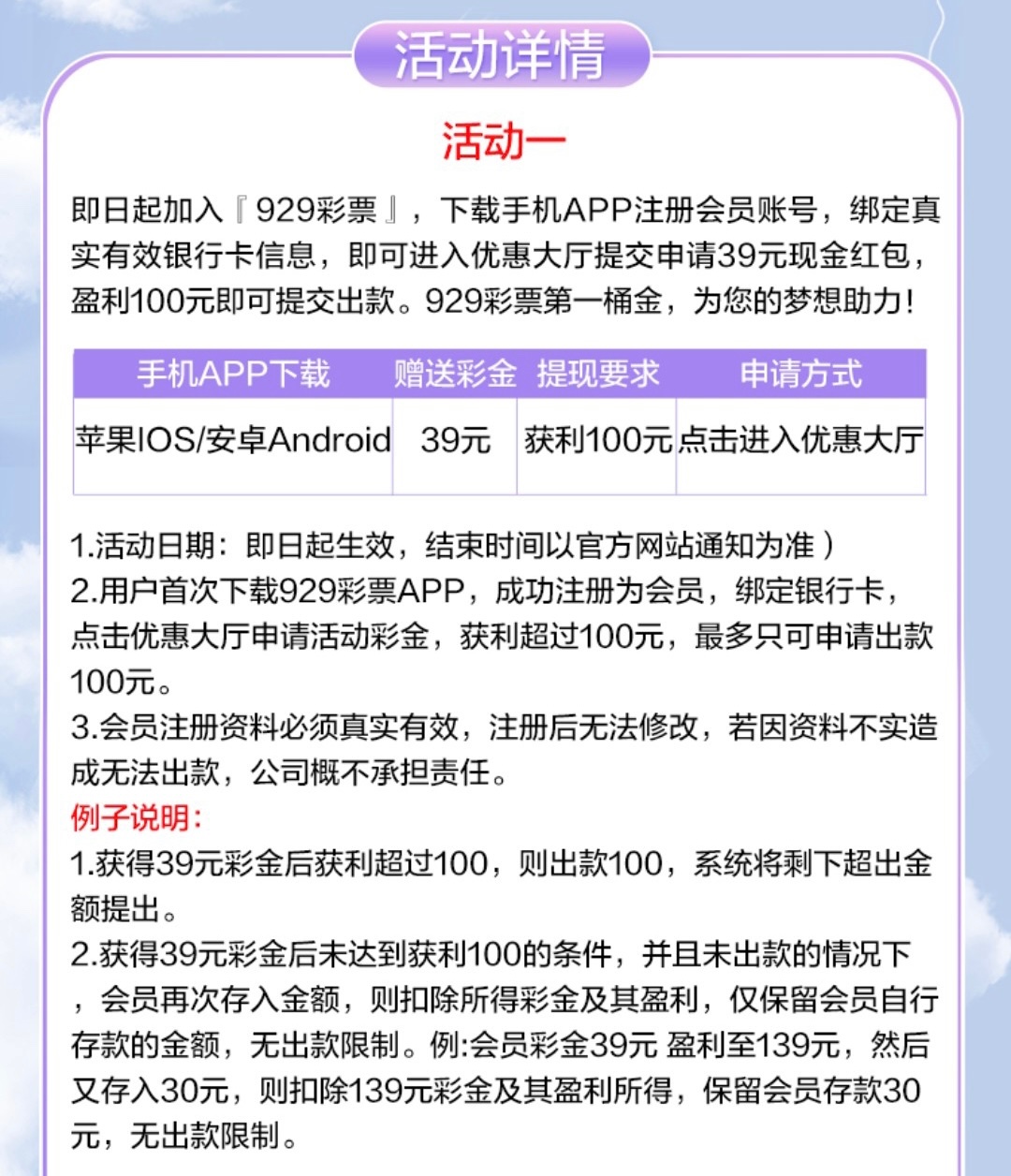 新用户注册完善个人信息 下载平台APP点击活动中心自助申请39彩金 满100即可提现!最高提款一百