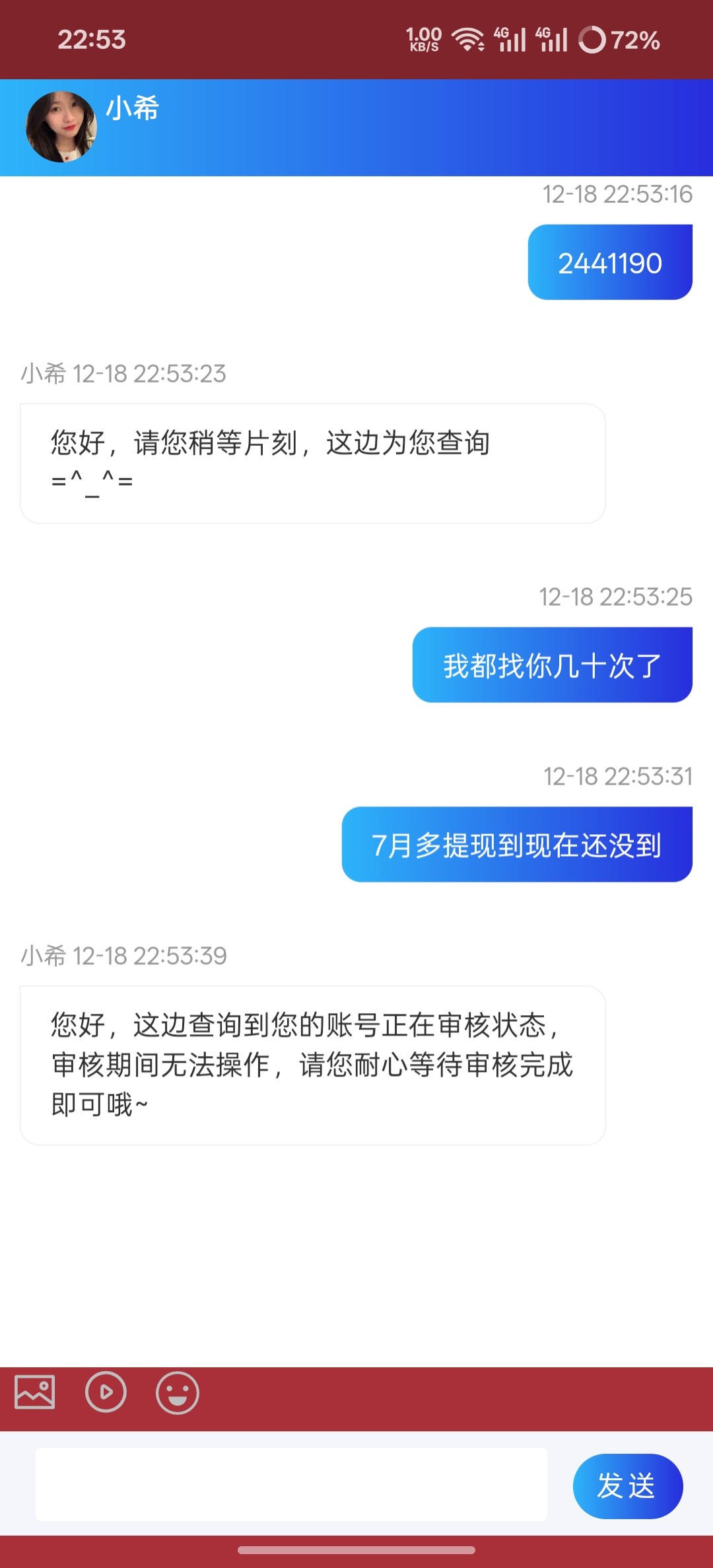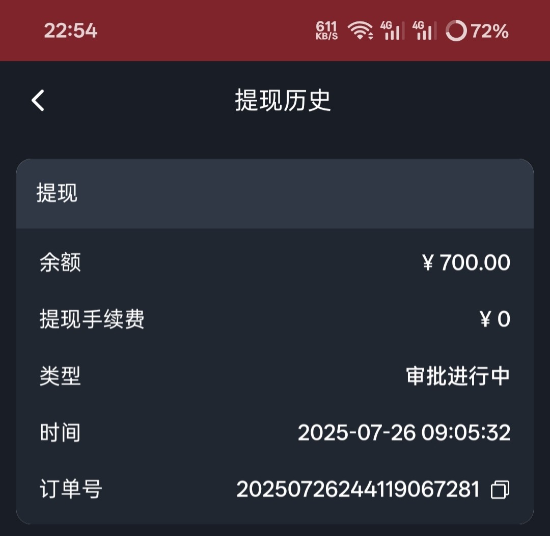 提现700到现在还没到账,就一直审核,7月都提现到现在找客服找了几十次就一直说审核大家注意避雷