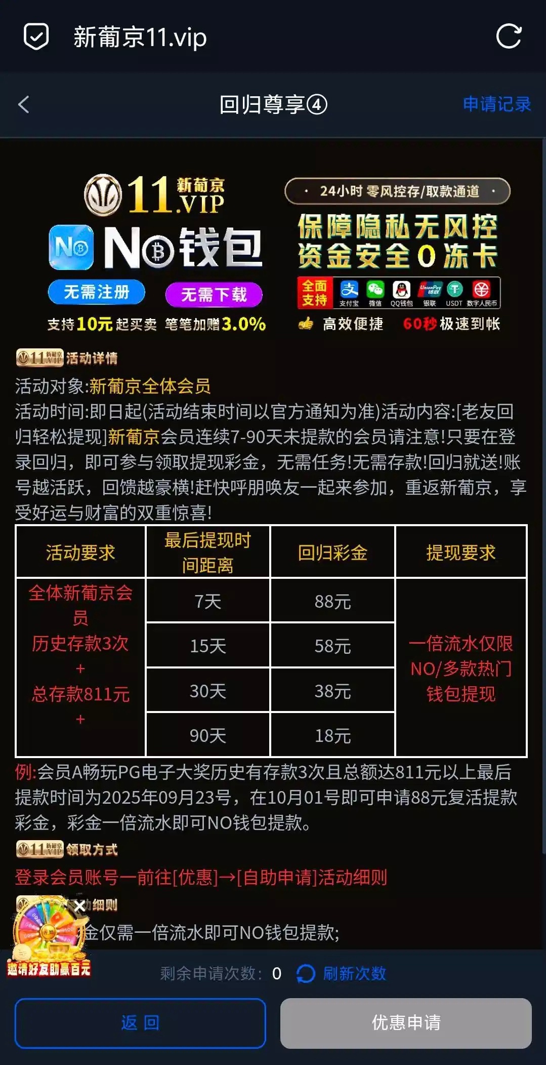链接11vip 存款3次大于811并且是回归用户去申请彩金一杯流水10可提活动看图