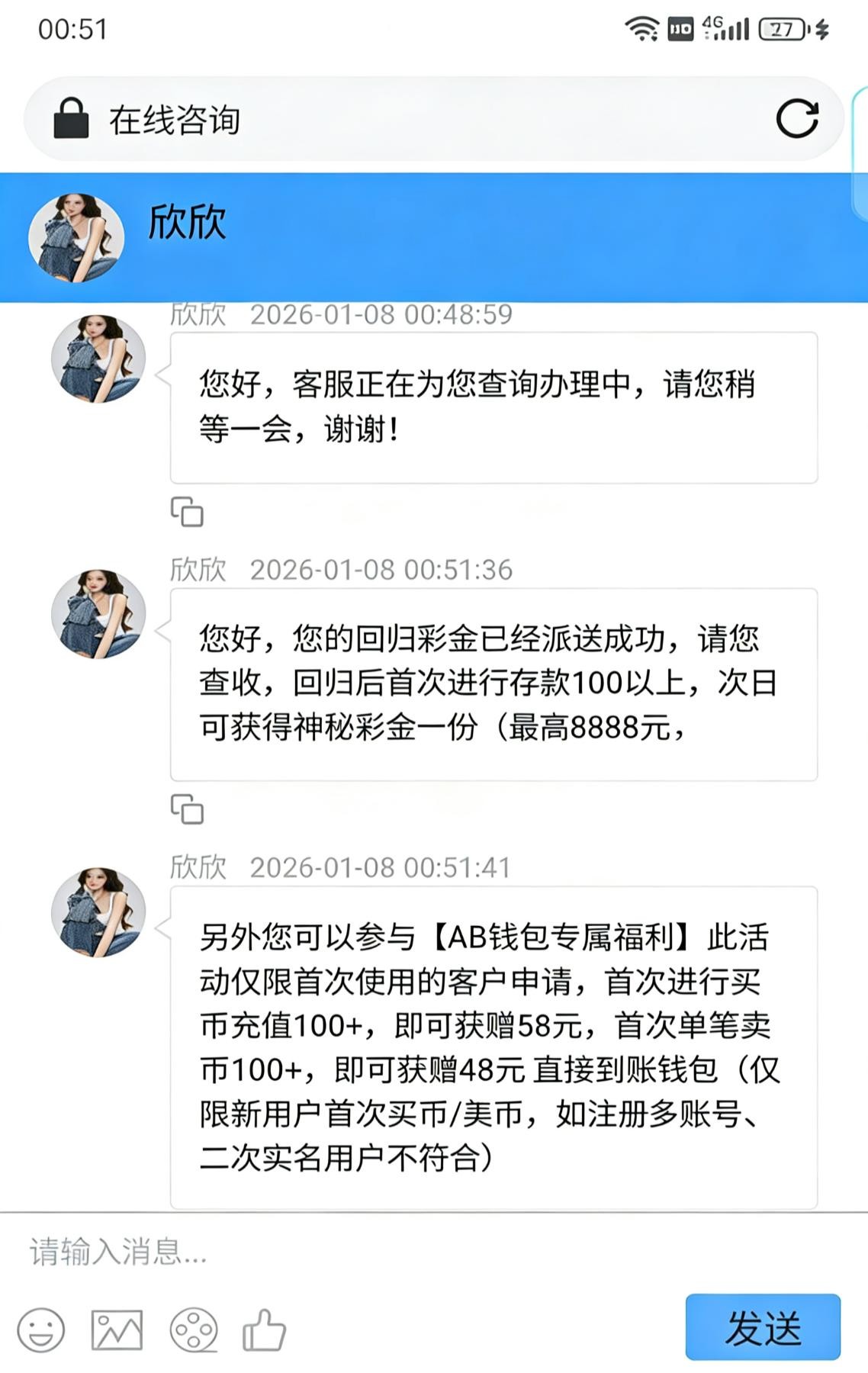老用户去找在线客服碰瓷回归彩金