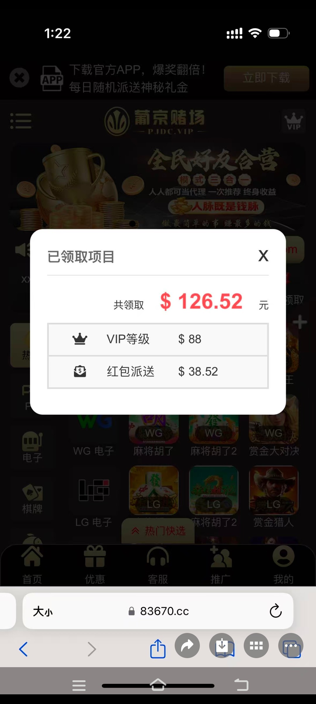 我朋友普京干到v10了,是不是送188彩金给他 上次我38 他直接128