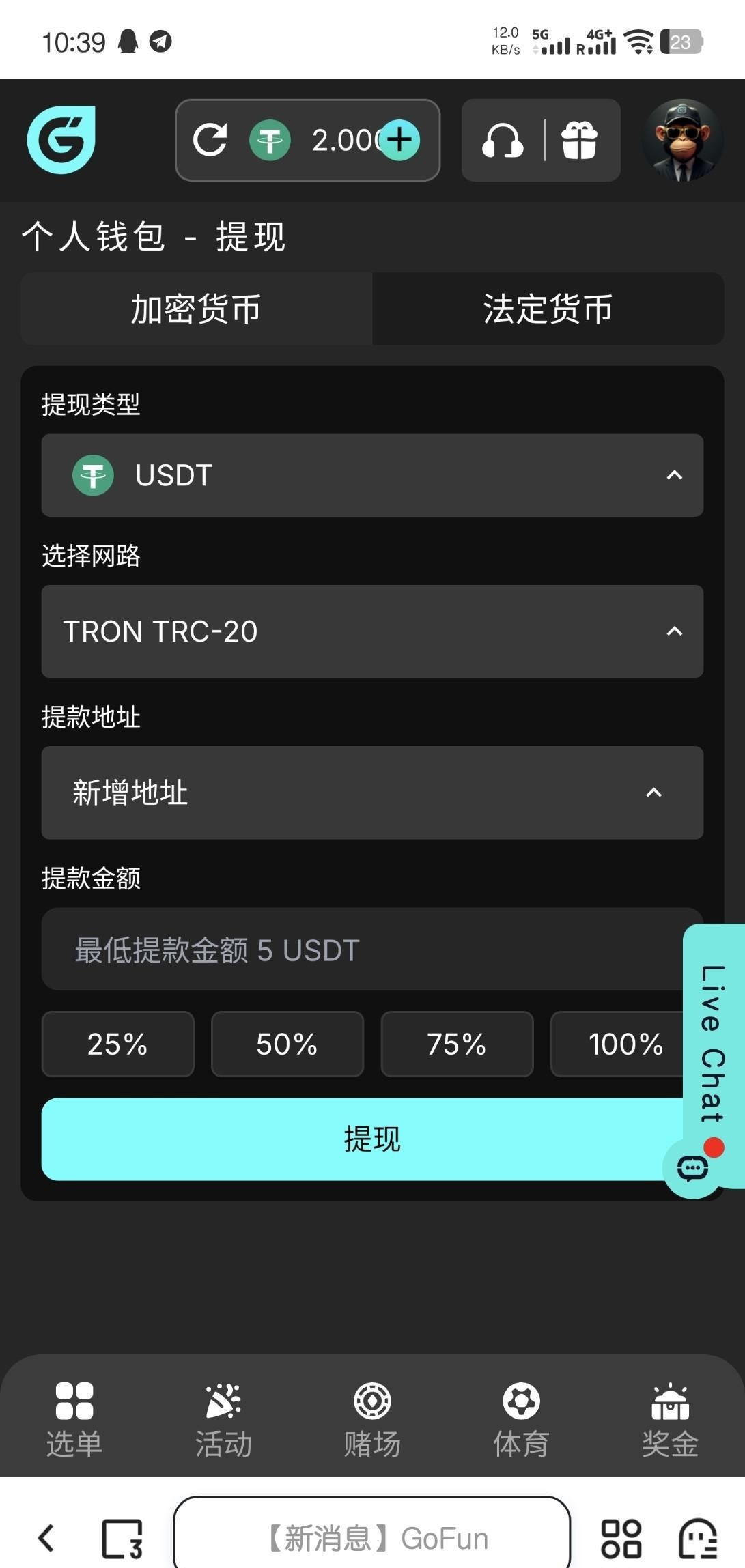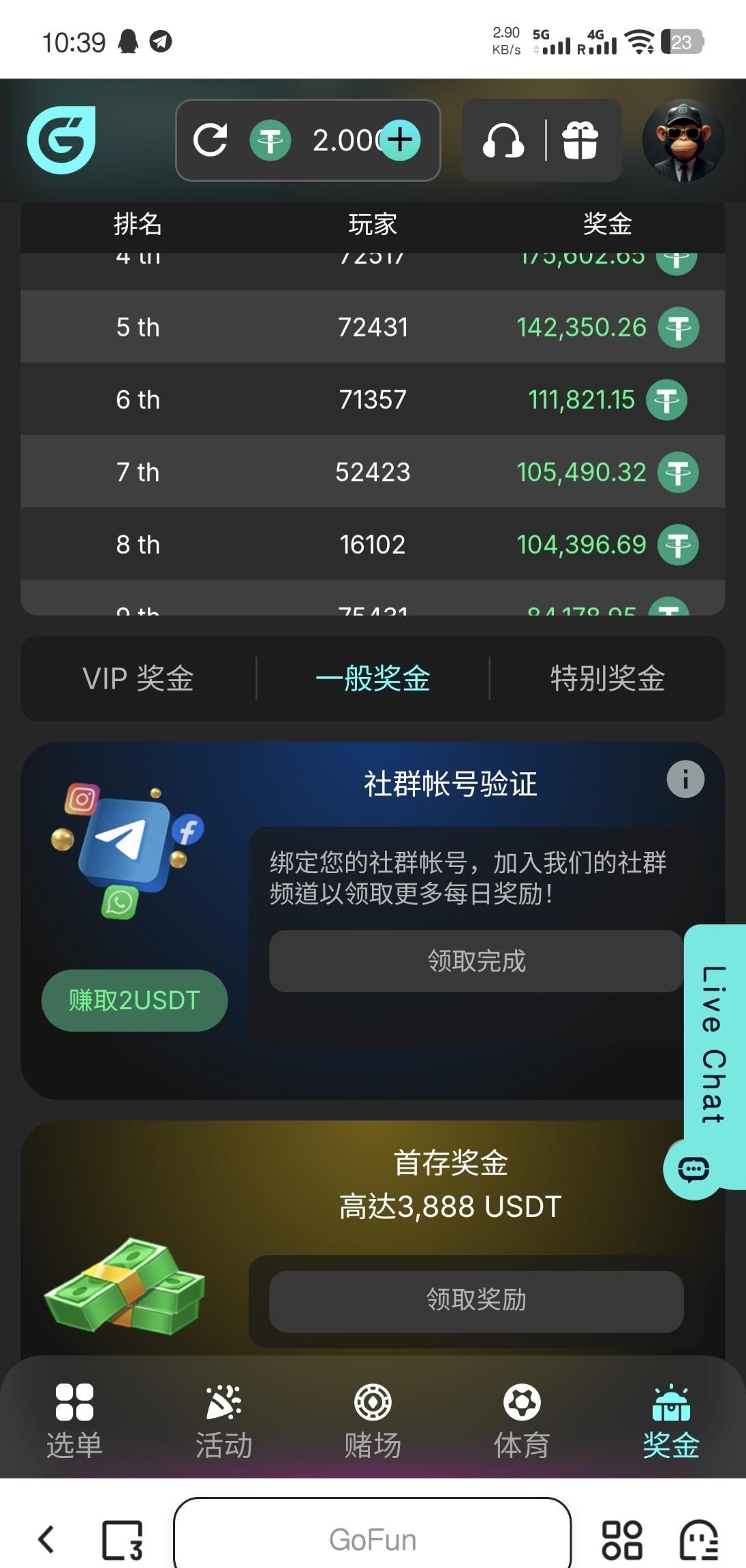 注册后在个人-奖金里找绑定社群账号的任务,3个任务完成领2U。不限场馆1倍水5U起提,我梭哈百家乐第二关没了,所以出款自测