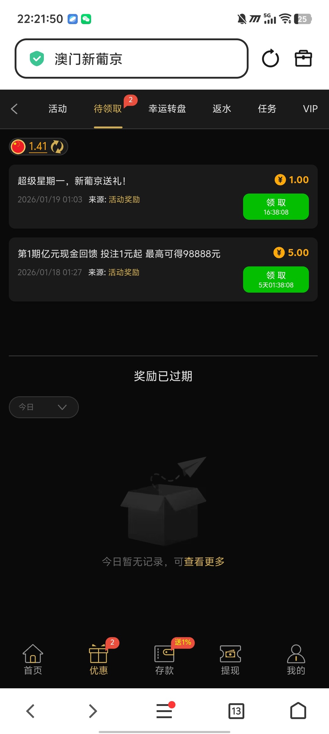 澳门新葡京回馈可以去领取一下,我投注了几百,你们充值过的应该很多