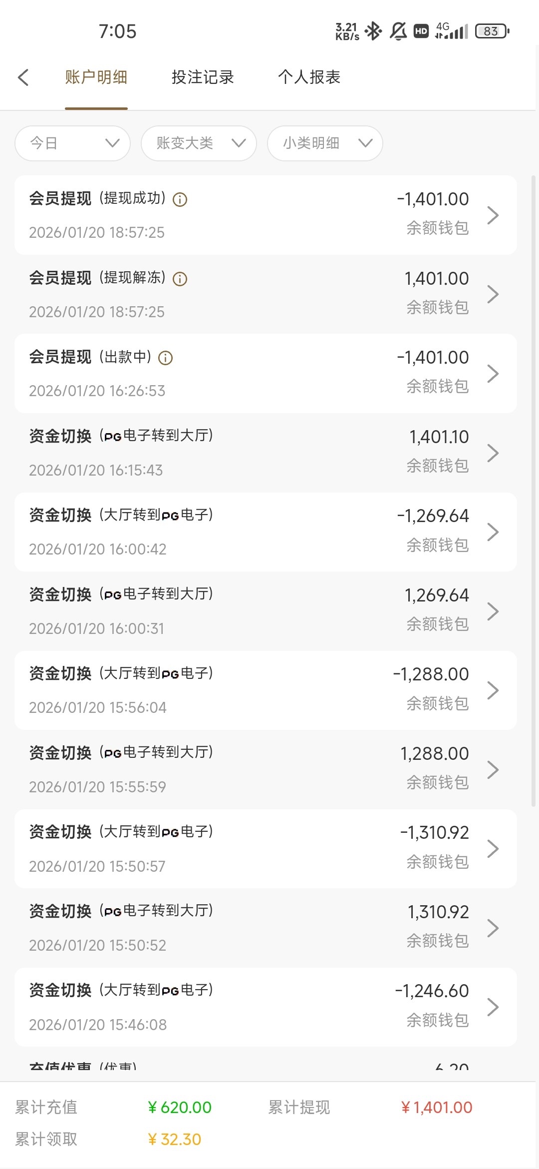 电话特邀领了26,提现需要充盈利同等金额。打到620充了620,提了1400