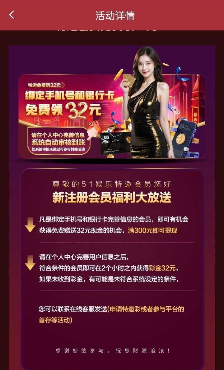 新用户注册完善个人信息 两小时内赠送32彩金 一定要把信息清除干净了再去 随机的看运气吧