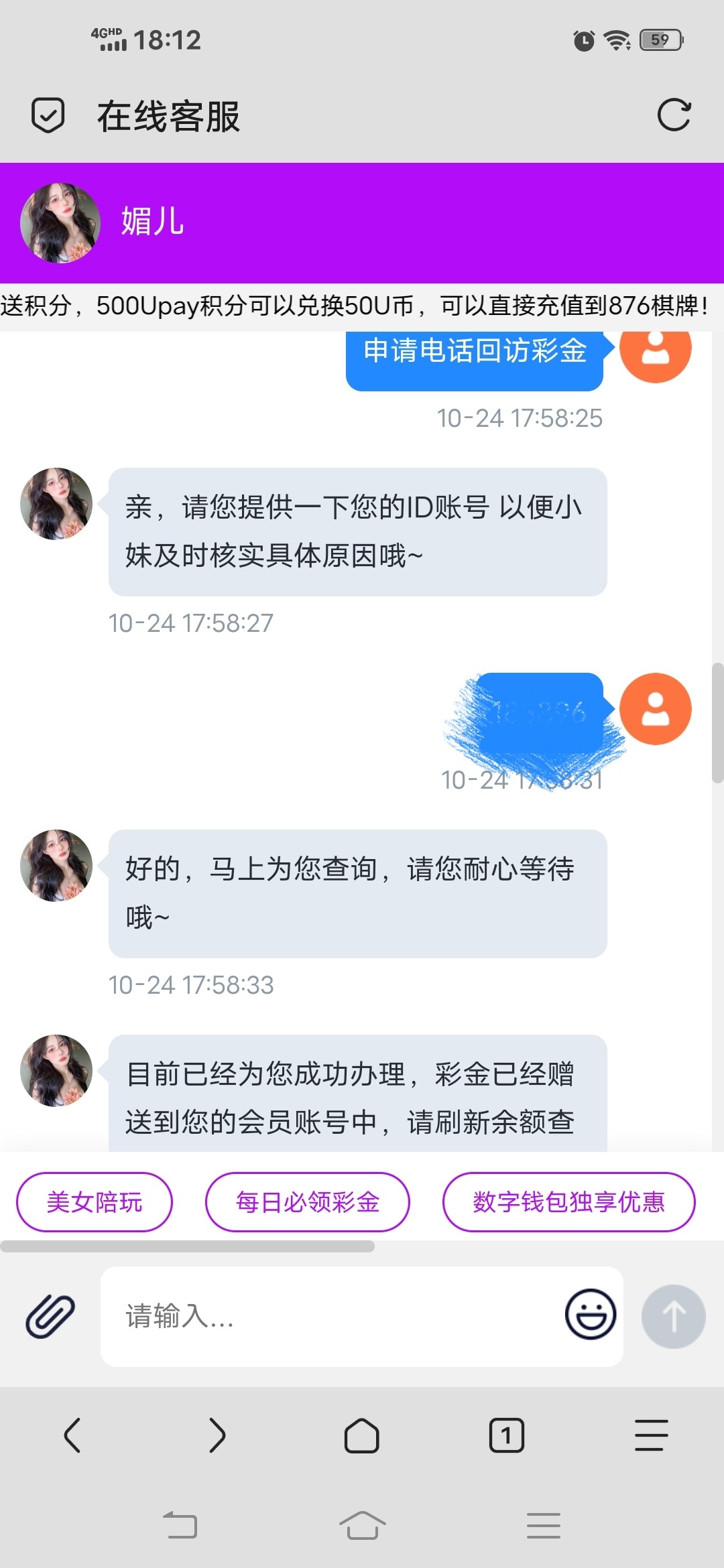 老用户上号 联系客服申请电话彩金。 我不是特邀也送了18,老号发电话彩金+id基本都送