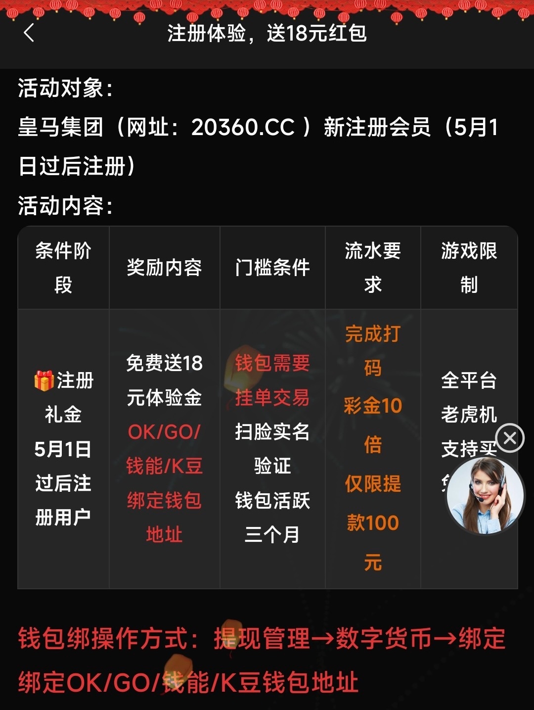 新用户注册完善个人信息绑定提款钱包30分钟内自动到18。游戏限制具体自测