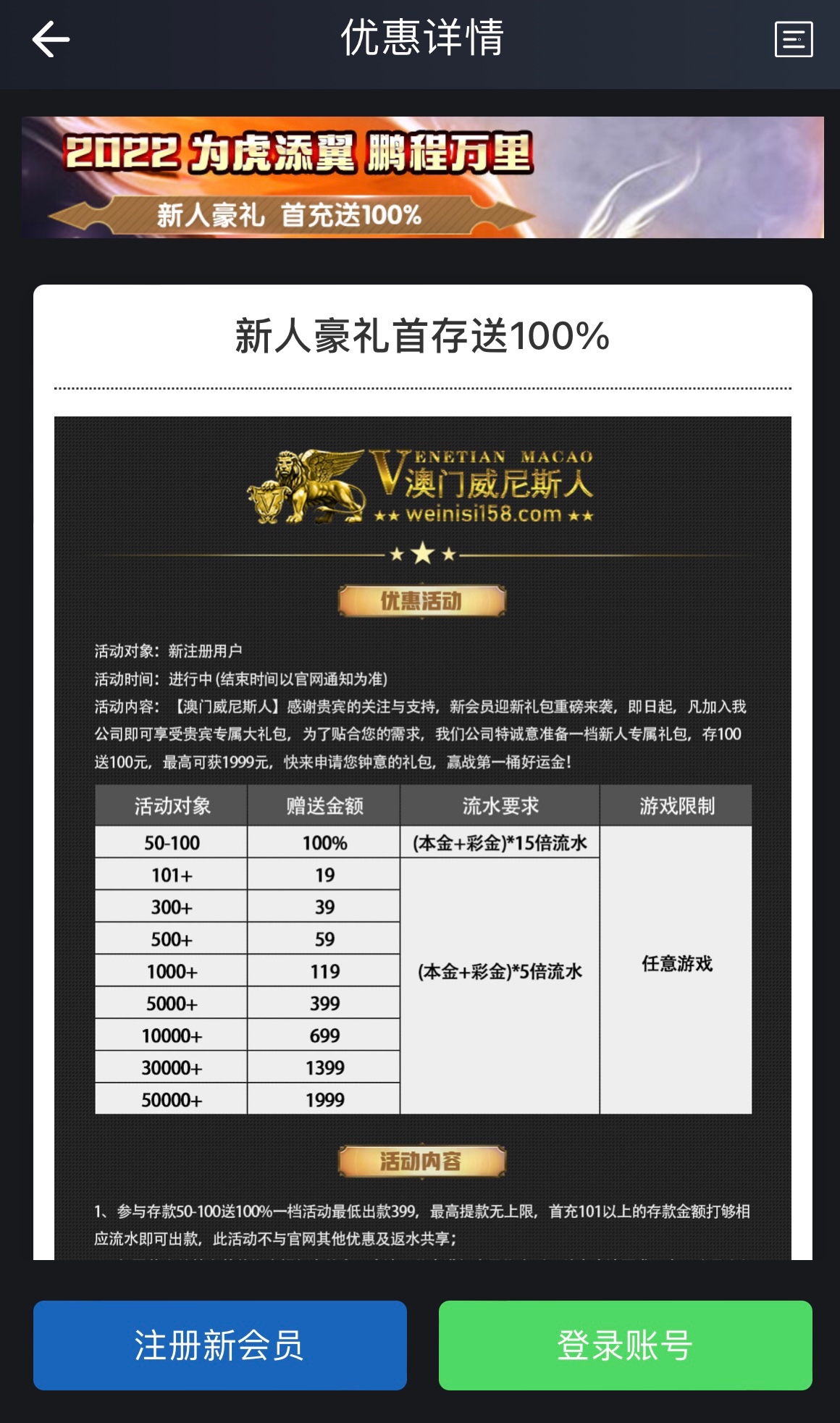 新用户首次存款50-100元存送百分之百