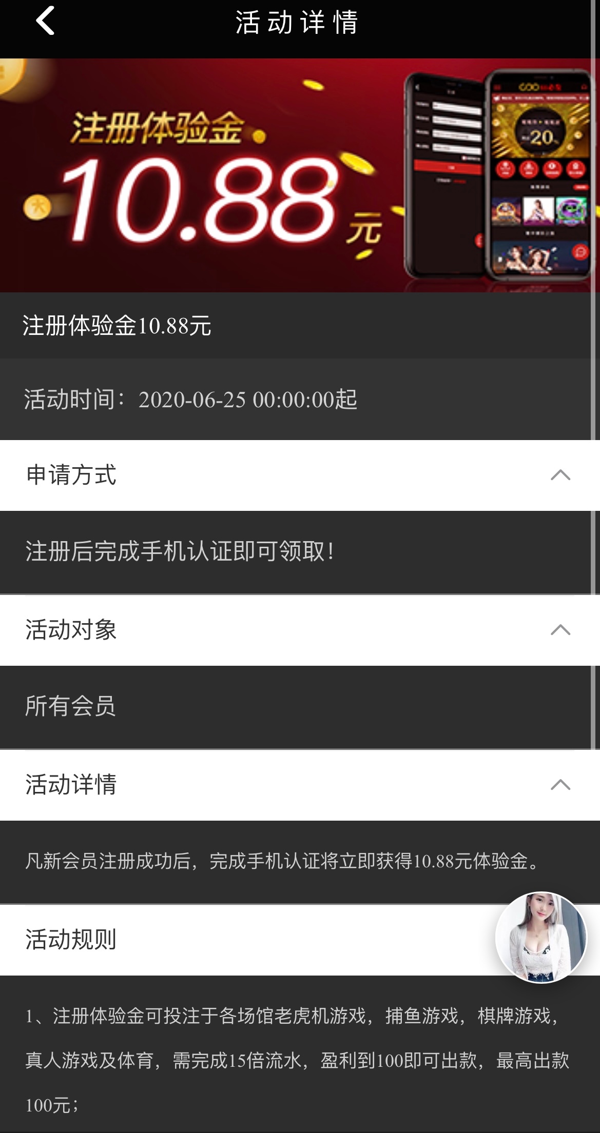 新用户注册完善个人信息进行手机认证即可获得10.88彩金,取款限制一百 15倍流水